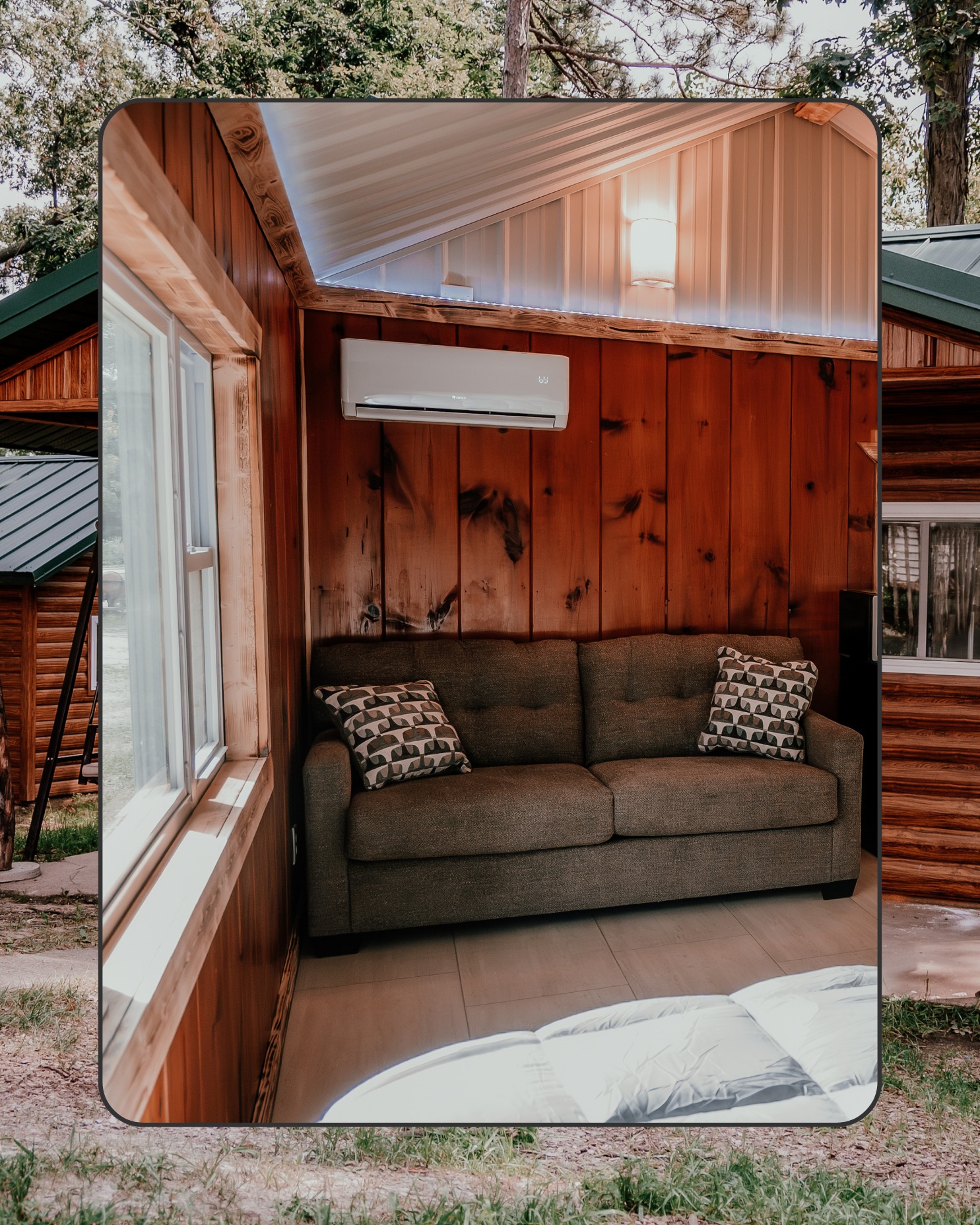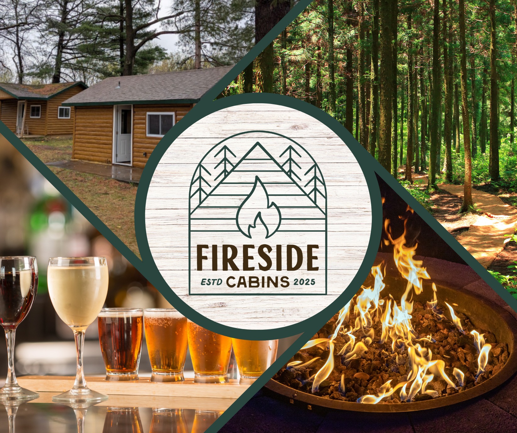 Fireside Cabins offers newly remodeled cabins, each with its own fire pit, and a unique garage bar on-site, serving beer and wine.