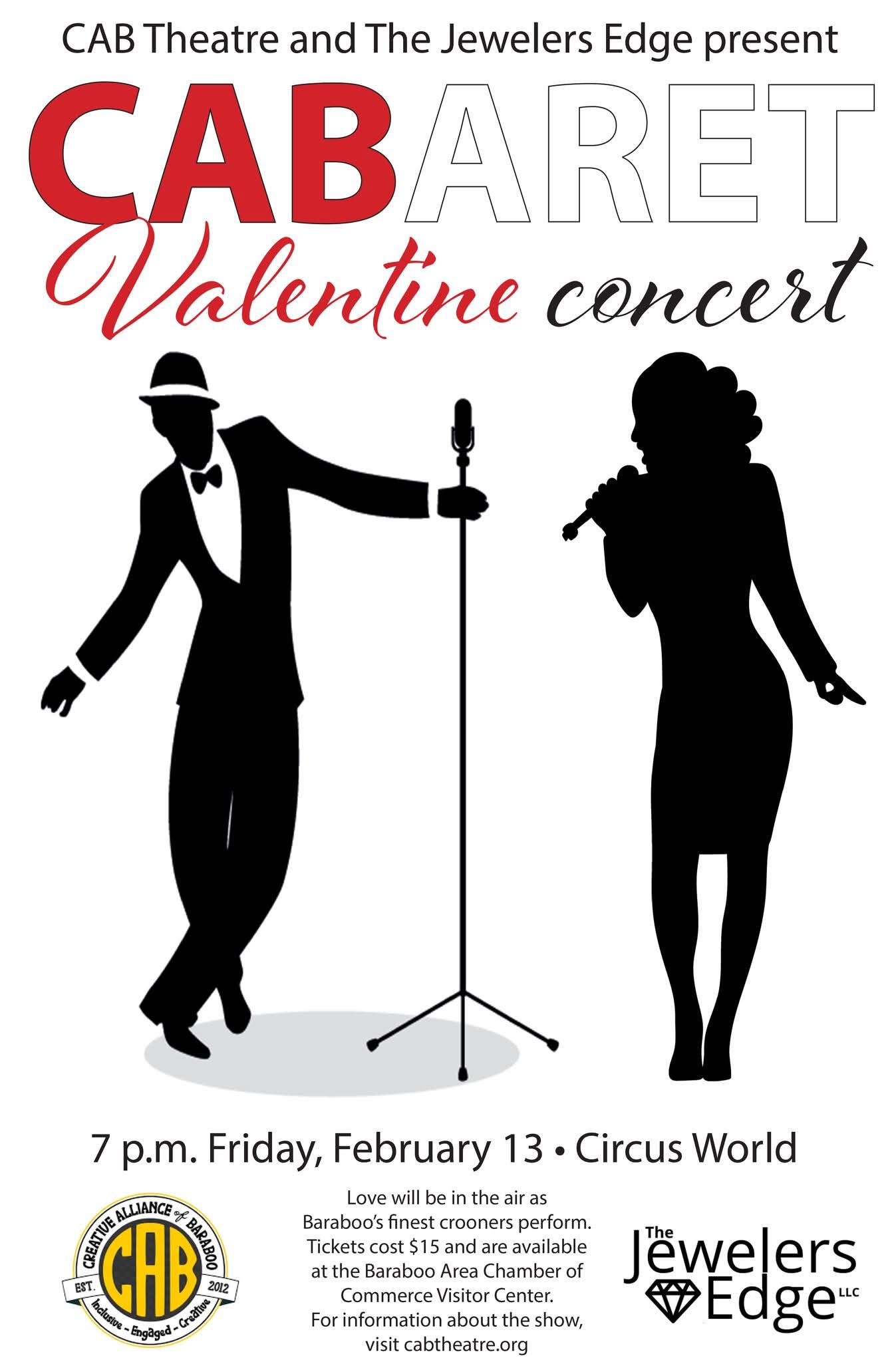 CAB Theatre and the Jewelers Edge present CABaret! Enjoy some romantic music sung by several Baraboo area crooners to celebrate love this Valentines Day weekend. Show starts at 7 p.m. Friday, February 13th at Circus World Museum. Two tickets to CABaret, sponsored by CAB Theatre and The Jewelers Edge.